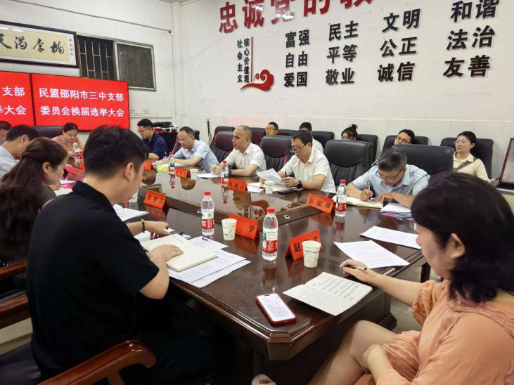 9月19日,民盟邵阳市三中支部召开换届选举会议,选举出新一届支部委员会。邵阳市政协副主席、民盟市委会主委孙清良,邵阳市三中党总支副书记、校长贺贝出席会议并讲话。民盟市委会专职副主委邹建山,民盟市委会委员、市三中后勤副校长岳爱民出席会议。