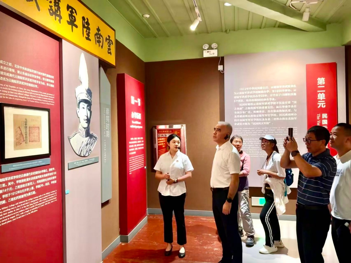 在云南昆明,调研组前往云南陆军讲武堂,从各项线索中探寻相关历史关键人物在蔡、张两人交往中的作用,挖掘蔡锷将军和云南讲武堂结缘、重九起义、护国讨袁的历史资料,仿佛触到一个多世纪前的那个雷霆之夜——蔡锷将军在此执起教鞭,烛光中的革命先辈歃血为盟,当染血军号吹响重九起义的冲锋令,新式滇军如利剑出鞘,支援四川的起义,切断清廷退路,促成西南各省独立,地图上蜿蜒的红色箭头,实为串联蔡锷与张澜理想的革命脐带。调研组一行还瞻仰了费孝通旧居,走访了民盟昆明市委会机关。