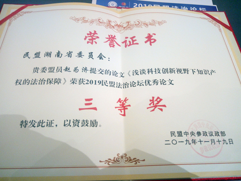 在开幕式上,民盟中央参政议政部部长范芳宣读了优秀论文表彰决定并举行了颁奖仪式。由民盟省委副主委、邵阳市人大常委会副主任、民盟市委主委赵为济和欧阳恩涛副教授共同撰写的论文《浅析科技创新视野下知识产权的法治保障》被评为优秀论文三等奖。
