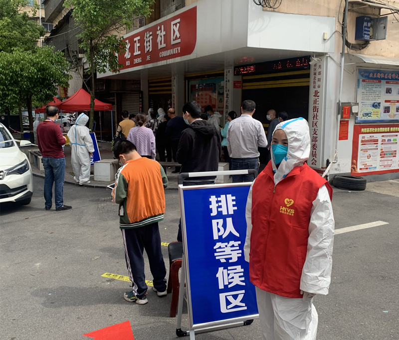民盟五中支部盟员戴紫芬老师,在所居住的北正街社区参加小区志愿服务,协助核酸检测准备工作、维护核酸队伍秩序、劝导居民不聚集不逗留,保持社交距离。