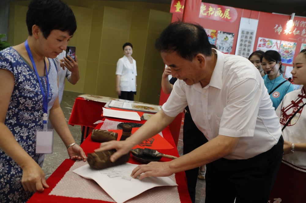 活动开始前,王军湘、于金旺和与会代表们参观了童心向党”主题非遗会展。“叔叔、阿姨、同学们好,欢迎参观宝庆烙画,烙画,又称烙花、火笔画,利用油灯、烟灯炙烤加热铁针、石条,主要在竹木材料表面进行烙绘,是我国非常古老的一种民间美术。清中期及民国年间,烙画技艺在邵阳流传较广,竹簧、手工抄纸烙画成为宝庆烙画的特色艺术形式。……”在非遗会展,滩头年画、宝庆竹刻、邵阳剪纸、城步苗绣、宝庆烙画、蓝印花布、宝庆瓷刻、羽毛画、邵阳根雕等国家级及省级非遗传统文化的大型作品展览,通过小小解说员的讲解演绎和小小志愿者的体验互动,让“非遗”文化在孩子们心中落地生根,让现场嘉宾与师生进一步加深对邵阳历史文化和风俗人情的认识和了解。