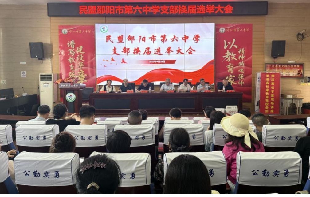 9月28日,民盟邵阳市第六中学支部召开换届选举会议,选举产生了新一届支部委员会。邵阳市政协副主席、民盟邵阳市委会主委孙清良,邵阳市六中党委书记胡伟文出席会议并讲话。民盟邵阳市委会专职副主委、内部监督委员会主任邹建山,邵阳市六中纪检书记欧阳浩出席会议。