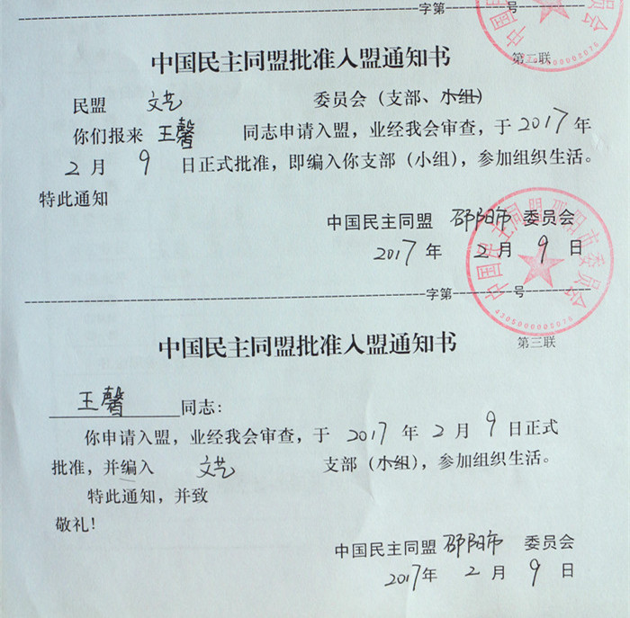 日前,从民盟邵阳市委获悉,邵阳市第十二届政协委员,央视“寻找刘三姐”全国总冠军王馨,被批准加入中国民主同盟,成为了民盟邵阳市委文艺支部新盟员。得知自己加入了民盟的消息后,王馨高兴地说,很开心加入民盟组织这个大家庭,我会更加努力地“撸起袖子加油干”,为民盟组织、为邵阳湘中湘西南经济文化中心建设、为中华民族文化复兴贡献自己的青春才华和应有的力量!