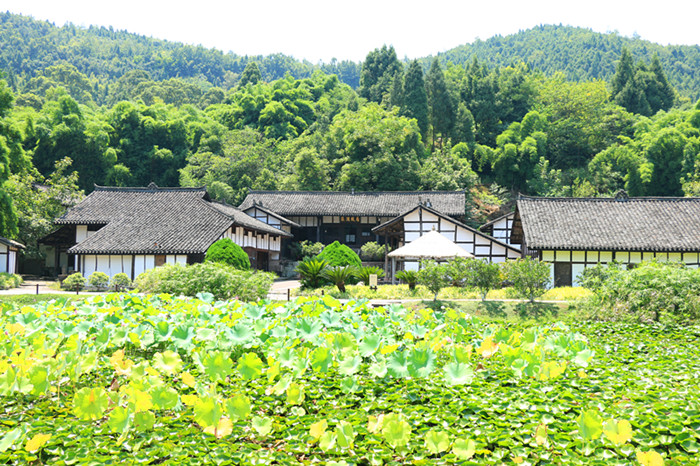 三合院民居后面是酷似圈椅的山峦,环抱着整个故居的建筑群落。后面林盘是“竹林书院”,清幽而雅静。是张澜少时读书的地方。林盘里有一面文化墙,是张澜先生1942年作《张澜自传》节选内容。月台前面是开阔的院坝,是打粮晒粮和族人聚会的场所。正中是一尊张澜先生身着布衣长衫,长髯翩然,目光深邃,面容慈祥的塑像。他仿佛回到熟悉的庭院,漫步在庭院前的莲池,微笑着品味那朵朵盛开的莲花。