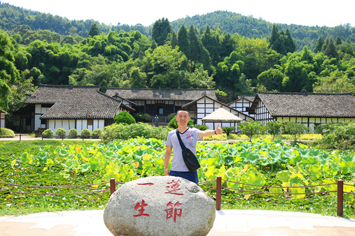 参观完历史陈列馆,在门前合影留念。讲解员带我们前往荷塘正前方的张澜故居。