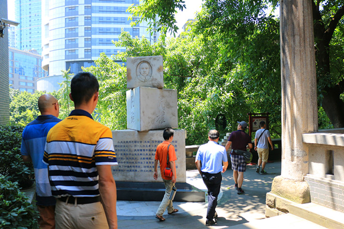 在张澜先生布衣长衫的铜像前,我们盟员同志们成月牙似地拱围在先生面前合影留念。