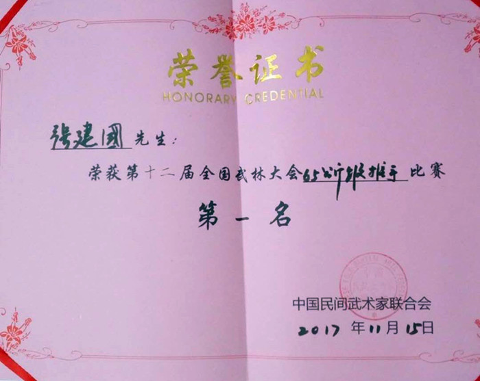 在为期数日的比武论道中,张建国老师一路过关斩将,经过多轮角逐,在决赛中,以多个精湛、娴熟、漂亮的推手动作完胜对手,最终当之无愧地夺得65公斤级武术推手冠军,赢得了评委席、观众席的阵阵掌声!