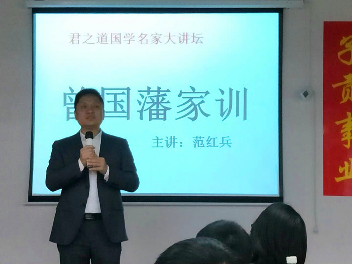 2018年1月21号下午,邵阳正大职业学校校长、盟员政协委员范红兵在“君之道·名家国学大讲堂”的第四讲主讲《曾国藩的家教家风》。君之道国学中心弟子及家长和慕名而来的市民近百人,一起听取了范红兵的精彩讲座。