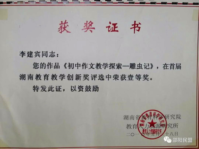 李建宾老师至今执教中学语文已有35年、是中学语文高级教师,曾获评为湖南省优秀盟员、邵阳市直教育系统优秀教师、邵阳市首批学科带头人、邵阳市书香教师。《雕虫记》因创造性的使用小说形式解说写作基础知识,参加首届“湖南省教育教学创新奖”评选获得一等奖。