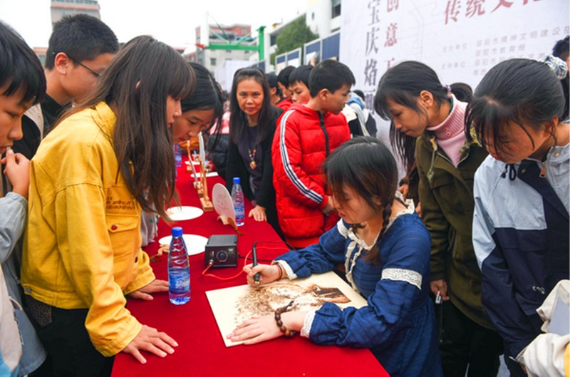 近日,邵阳市乡村学校少年宫大联动之“传统文化进校园”活动在隆回县桃花坪街道雨山中学举行。民盟盟员宝庆烙画传承人唐文林、王艳萍将创作的《老手艺》作品进行了展示,并带领徒弟进行现场演示与师生们进行互动。《宝庆烙画》因精湛的竹刻技艺赢得了围观师生连连称赞,“第一次近距离接触到这么多优秀传统文化,为中国博大精深的传统文化感到自豪,以后将努力学习传统文化。”优秀的民族文化是新时代进行思想道德建设的重要思想养分,深入挖掘和利用传统文化中的道德精髓,弘扬中华民族优秀传统美德,加强思想道德建设,对凝聚全社会的力量,实现中华民族的伟大复兴具有重要意义。
