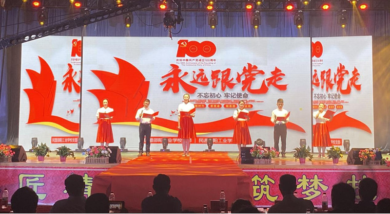 颂百年风华,展时代新颜。为期两个多月的邵阳工业学校庆祝建党100周年校园文化艺术节,6月10日在学校体育馆圆满收官。在闭幕式晚会上,民盟盟员王丽辉、陈凤、申俊伟与三名民进会员合作朗诵的《我们永远在一起》节目,备受瞩目,深受广大师生的喜爱。