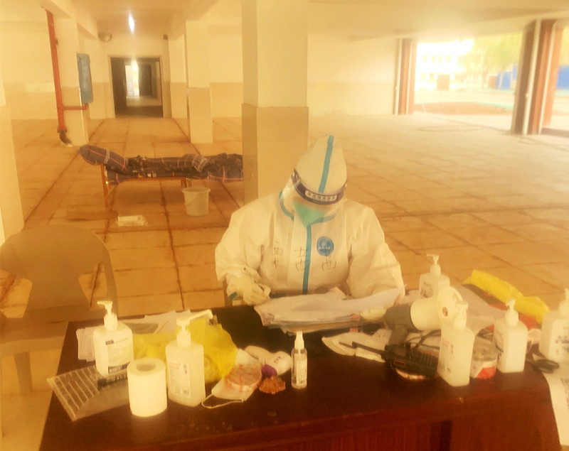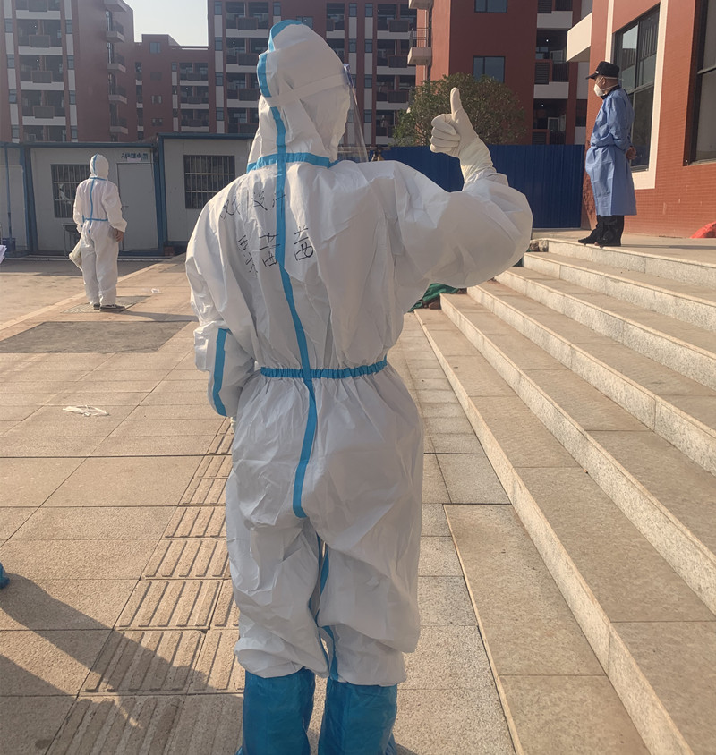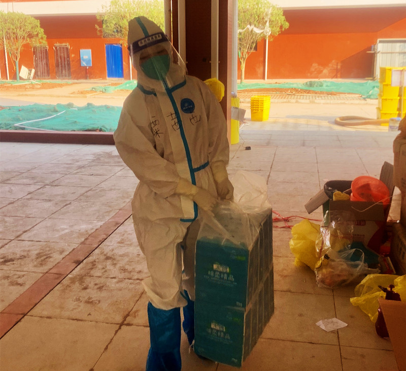 相信昨晚我们组的志愿者都没太睡好,因为随时会通知我们接收隔离人员,所以都没睡的太沉,不敢漏掉任何消息。天刚蒙蒙亮便接通知:快速吃完早餐,穿上防护服进隔离区,我们1栋要开始进隔离人员了!