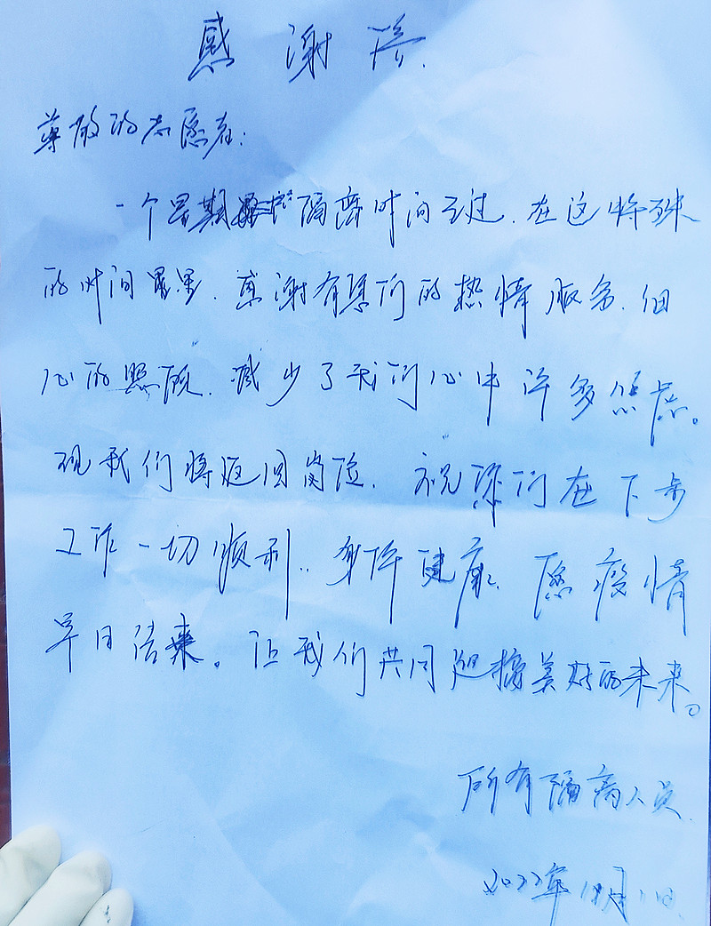 车子来了之后,接到解除隔离通知的人员便下楼排队,让我们十分惊喜的是,好几位隔离人员给我们送上了他们亲笔写的感谢信,信中的话让我们感动不已:“换位想想,你们也是家中孩子,为人父母,面对组织的号召,不顾个人安危,进驻隔离点,毅然踏上这未知旅程……”“你们是平凡的逆行者,是在这场疫情中奋战的英雄”……看完这些感谢信不禁湿润了眼眶,原来我们的付出和关心都有被他们看见,此时,一切的辛苦和汗水都值得了。