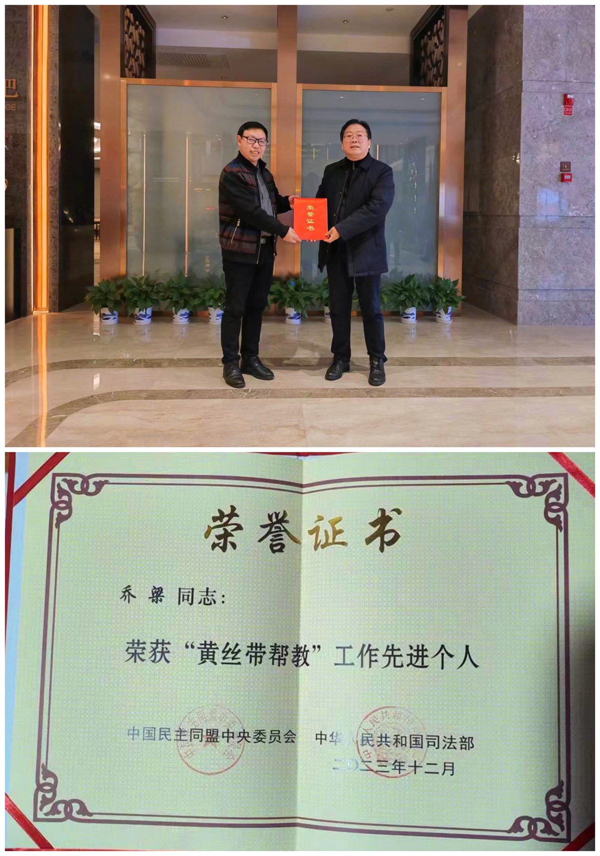 在中国民主同盟中央委员会与中华人民共和国司法部联合主办的2023年度司法系统“黄丝带帮教工作”总结表彰大会上,省政协委员、市政协常委、民盟武冈市委会主委、武冈市司法局局长乔梁,荣获“黄丝带帮教工作”先进个人。