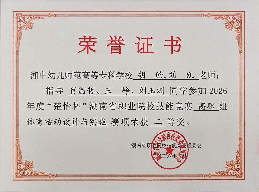 近日,2026年度“楚怡杯”湖南省职业院校技能竞赛高职组《体育活动设计与实施》赛项在湖南省体育职业学院隆重举行。由民盟湘中幼专总支盟员胡璇等教师共同指导的学生代表队,凭借扎实的专业功底、出色的临场发挥和良好的综合素质,在激烈竞争中脱颖而出,荣获赛项二等奖。